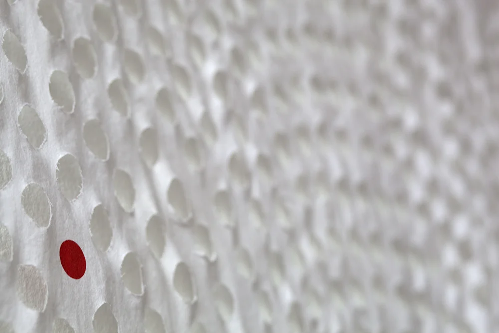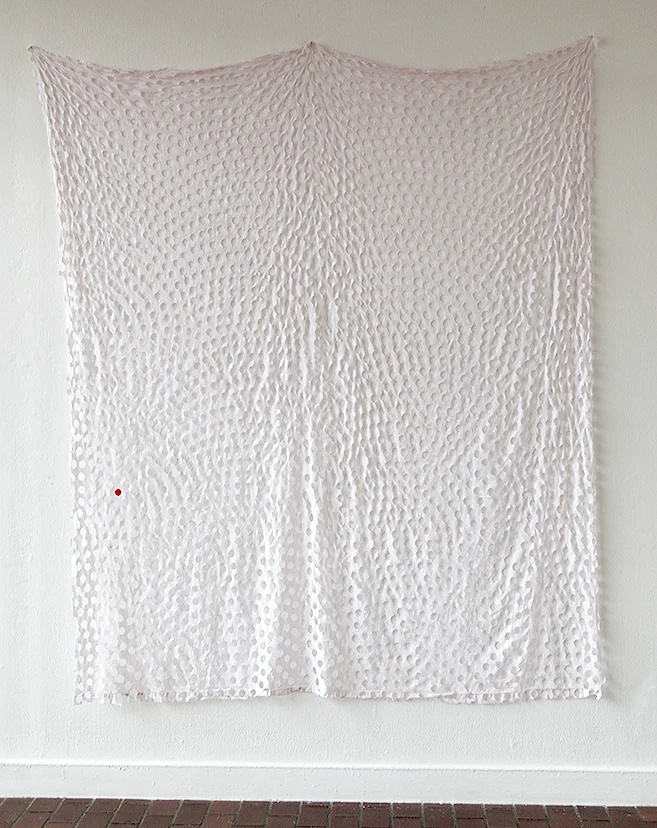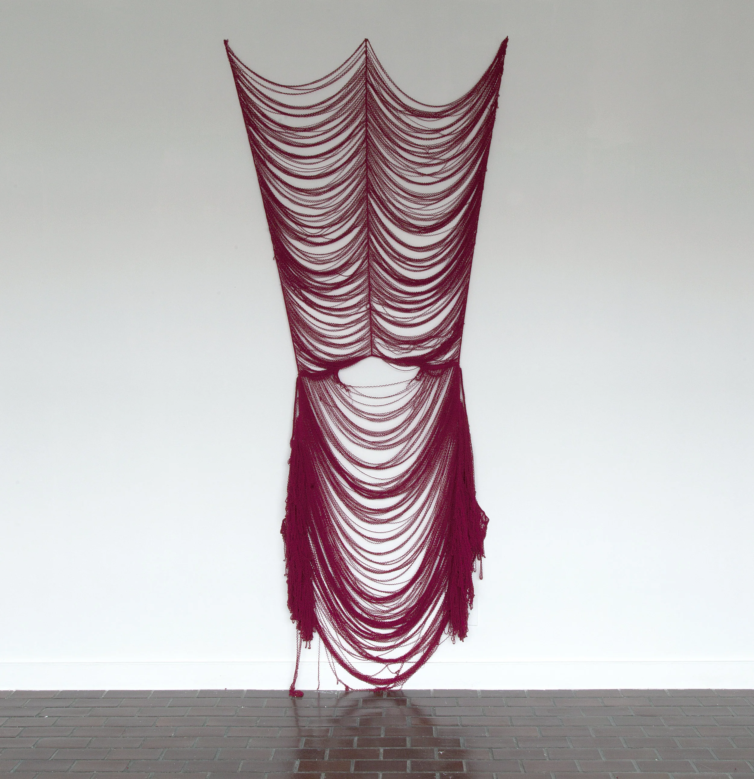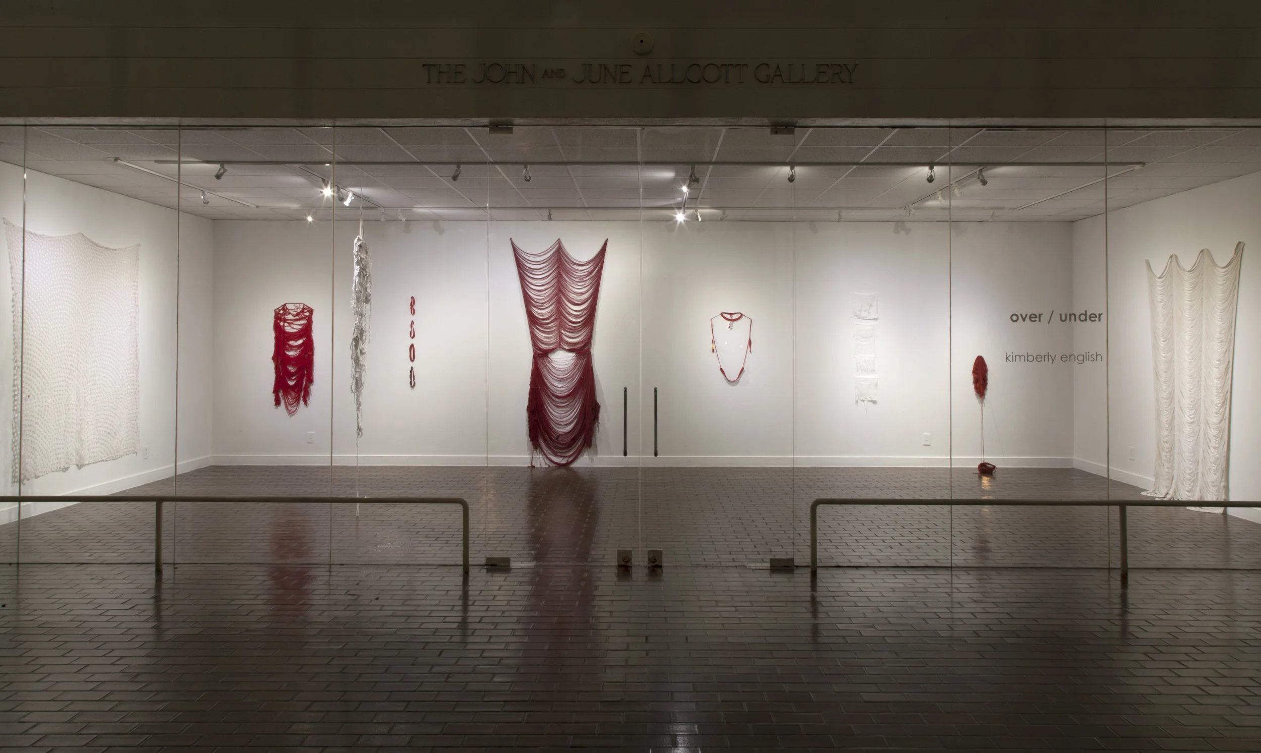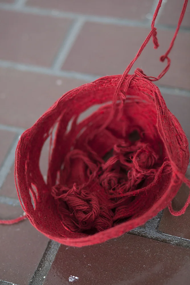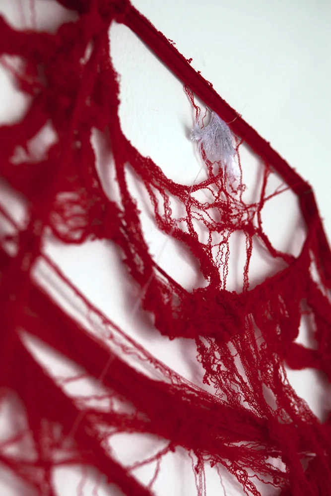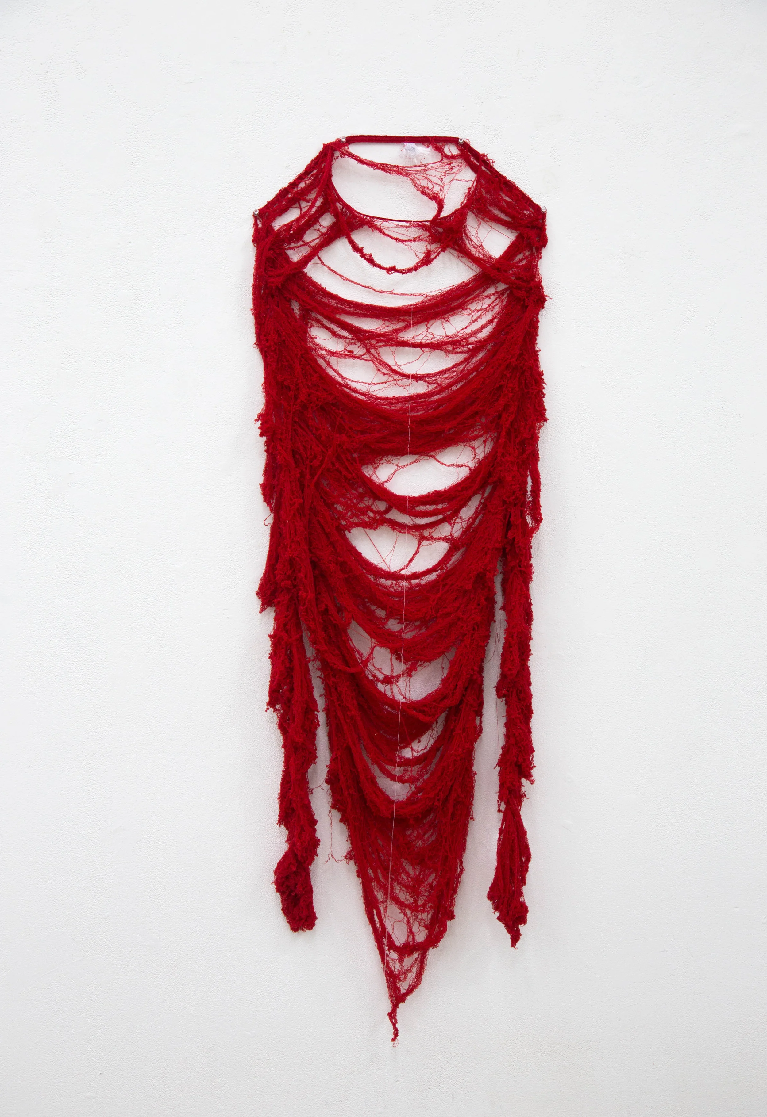 over / under is an examination of labor. This exhibition features textile works that critically investigate “women’s work”. Through traditional and unfamiliar manipulations of textiles, the corporeal and the corporate are confronted in the negation of function. In this work, formal responses to the female body, mechanical labor, and the structure of fabric catalyze cloth to become ubiquitous with the body. The notion of “women’s work” is evolving with contemporaneous globalization and industrialization, and the textiles’ labels of origin act as evidence of their collision. This exhibition invites a connection between bodily and massmarket production, as these works dwell in the space somewhere between the repulsion of blood and the necessity of Target (and vice versa). Red conjures the bodily and the superficial simultaneously. In the midst of late capitalist industrialization, still the body labors. Menstruation, mopping, and mechanical reproduction straddle the chasm of human production, magnifying the female worker as the catalyst in over / under.